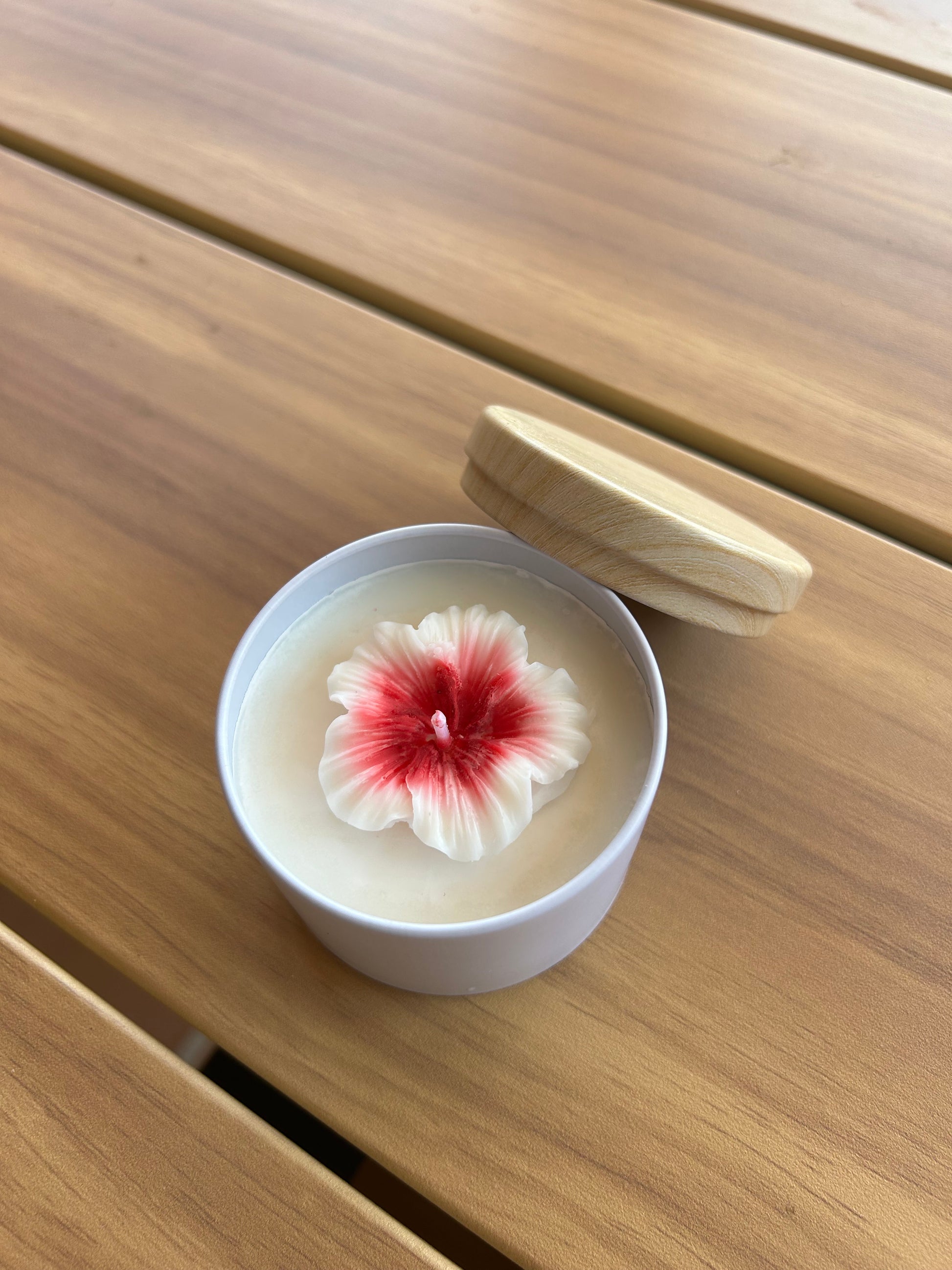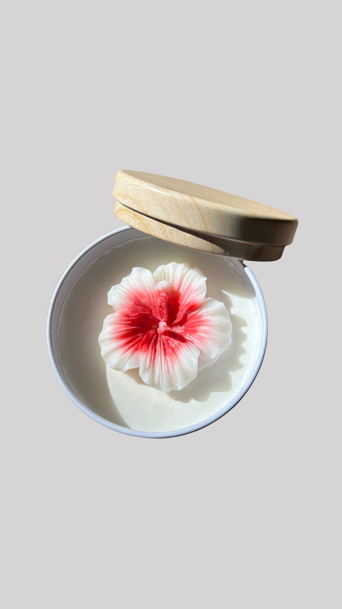 Vela de vainilla y bergamota. Flor de hibisco con pigmento fucsia.
